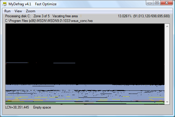 The strength of the program lies in its flexibility. Other defragmenters organize your disk really well, and up until now UltimateDefrag has provided the most flexibility in terms of file placement. Not any more.. MyDefrag provides the user with a virtually limitless ability to choose where files are located on the disk. The main program is more accurately defined as a script interpreter. Each type of defrag exists as a .myd script, and when you run them the defragmenter parses and executes the script directives. Sounds clunky, and to tell the truth unless you’re a serious computer hacker (this means if you have an iPhone you can pretty much stop reading now) you should probably use one of the more straightforward, easier programs out there – but if you’re willing to get immersed in the scripting concept you can pull off some pretty neat stuff with this. Basically, your script will identify a target for defragmentation, exceptions, and a method by which to defragment it and any additional pieces such as leaving a small chunk of free space after that “zone” has been defragged. Then you tag other targets and have the program act on those in turn, and so on until the drive is done. My current script will optimize and sort all directories to the absolute fastest portion of the disk. Then it defrags and moves the MFT directly after that – one cannot do this with UltimateDefrag because the only option it gives you is to move the directories “close” to the MFT, which actually means after it. Next, the list of files from the prefetcher (layout.ini) feature of Windows, in order of import. Next, all other files EXCEPT those that match a certain criteria (Picasa database files, other large files) are defragged. Finally, everything else is done and the drive is complete. I actually slightly modified the SlowOptimize.myd provided standard with the program to do the above. You can edit and position file “zones” to your heart’s content – if you’re anal-retentive enough (adjusts tie and sips piña colada) you could make a different script for every drive on your system and have full control over how they are defragmented based on their contents. There are other subfeatures too, such as a “slowdown” command with which you can reduce the amount of system load placed by MyDefrag – great for regular scheduled background defrags of high-activity servers, for example. The UI is also kinda fun to look at, if you’re a quasi-autistic like me. My wife walked in on me staring at this thing defragmenting a drive, opened her mouth like she was going to say something, then shrugged and left. Which was entirely the correct thing to do. *8-)