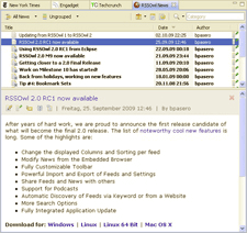 RSSOwl is a very nice, free RSS reader which is built on the Eclipse framework. It’s very configurable, isn’t too sluggish with loading and saving tens of thousands of articles, and quite frankly decisively wins over both GN and FD in terms of look and feel. You can find a full overview of its features here. After less than a week using it, I already feel it’s deserving of the coveted Dhryland Hot Download Award ranking.